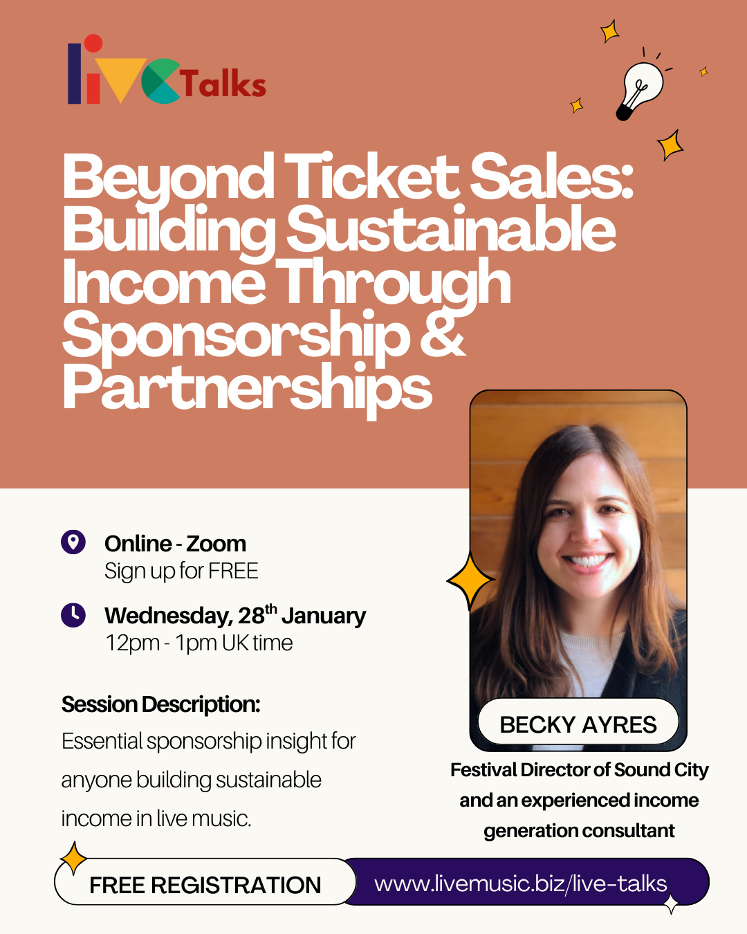 Led by Becky Ayres, Festival Director of Sound City and an experienced income generation consultant, this session is grounded in over 15 years of delivering six-figure annual sponsorship and funding targets. In the past year alone, Becky has supported festivals and arts organisations to secure over £100k in new revenue, helping to stabilise cashflows and build more sustainable operating models.